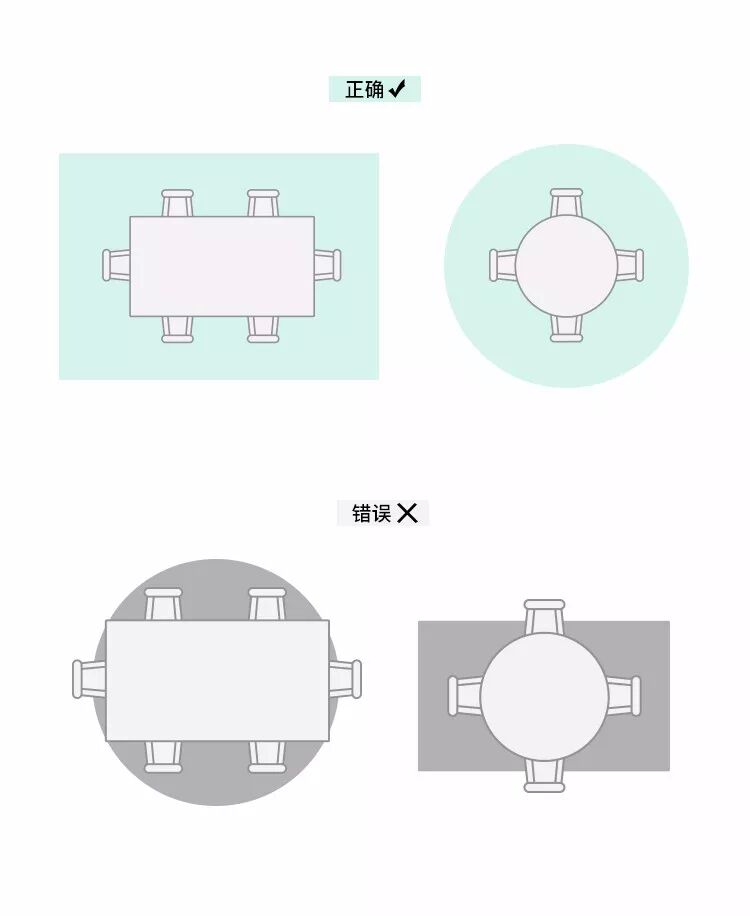 餐廳的選擇,主要根據餐桌的形狀進(jìn)行變化。將餐桌餐椅全包括在地毯內,將更有融合感。而露出局部的餐椅,則容易有割裂空間的感覺(jué)。