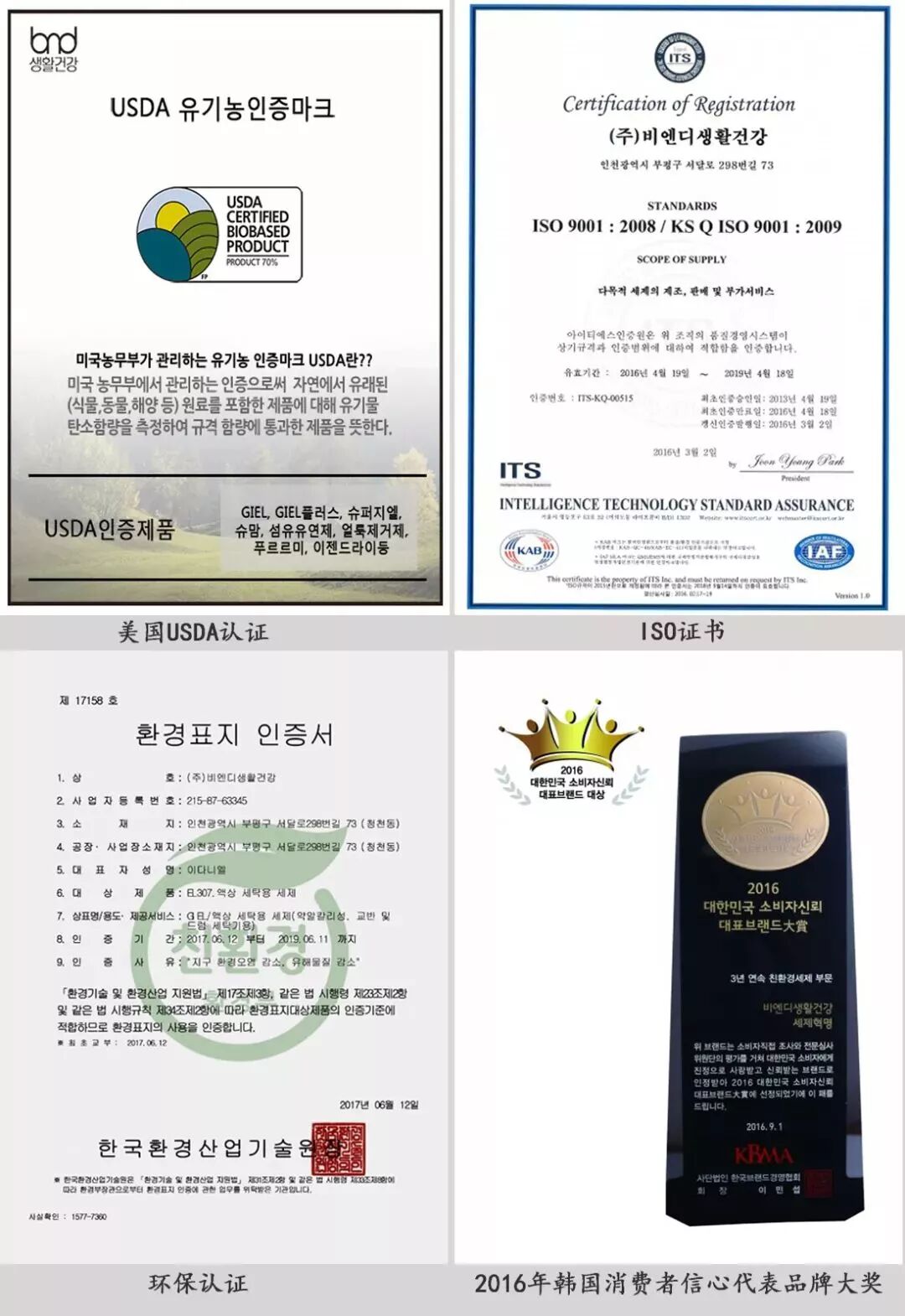 他們家堅持所有的產(chǎn)品都使用環(huán)保成分制造,并通過(guò)了美國USDA認證、ISO認證等,還曾獲得2016年韓國消費者信心代表品牌大獎。