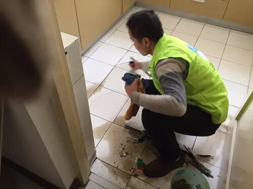 ??(4)、這一步是清理衛生間。衛生間的墻壁可以用清潔球來(lái)清理,主要是瓷磚的縫隙當中的污泥,還有瓷磚表面一些水泥點(diǎn)、油漆點(diǎn)等污漬。清潔完墻面之后,再用清潔劑、不銹鋼清洗液、毛巾等清潔衛生間的水龍頭、管件等。這些都做好了之后,就是對衛生間地面的清潔了。地面清潔可以使用洗地機,要注意地面的角落等一些洗地機清潔不到的地方,用刀片、清潔球等清理干凈。