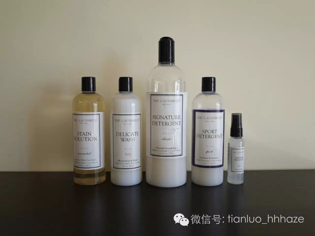 Laundress洗衣液,從左到右依次是衣物去漬清潔液、細致衣物洗潔精、全效經(jīng)典洗衣液、運動(dòng)衣物洗衣液和衣物除皺噴霧。購買(mǎi)途徑為淘寶、10/10等實(shí)體家居店。