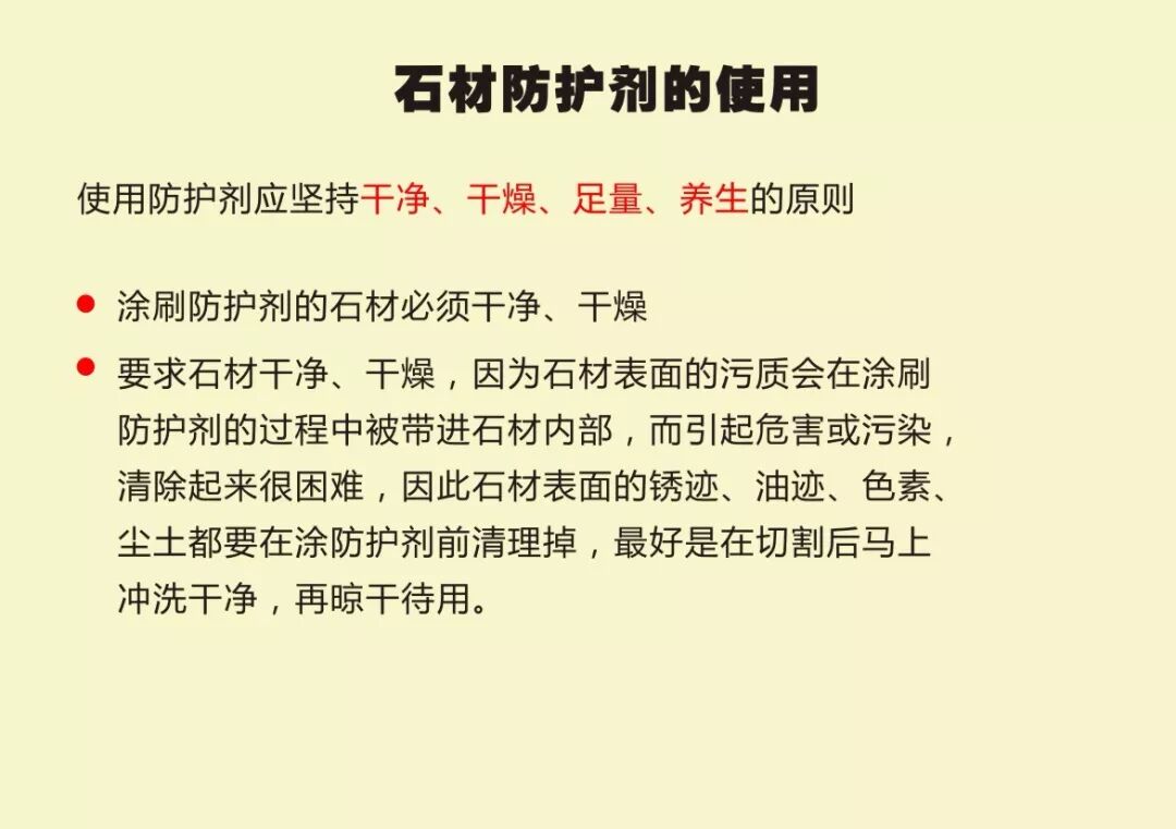 2、 石材要保持干燥。要進(jìn)行防護作業(yè)的石材表面需要保持干燥狀態(tài)。為什么要保持干燥狀態(tài)呢?一是因為如果石材是潮濕的,會(huì )影響石材對防護劑的吸收與滲透,影響防護的效果。二是因為如果石材是潮濕的,涂刷了防護劑后石材內部的濕汽無(wú)法及時(shí)的揮發(fā)出來(lái),會(huì )引起石材水斑、銹黃等病癥,影響石材的裝飾效果及使用壽命。如果石材表面有潮汽或水斑,需待石材干燥后方可作業(yè)。