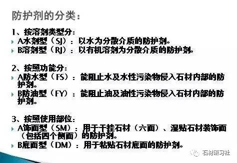 3、 按使用部位分為飾面型和底面型。飾面型的防護劑用于干掛石材(六面)、濕貼石材裝飾面(包含四個(gè)側面)的防護劑,底面型用于粘貼石材底面的防護劑。將材防護劑分成“飾面型”“底面型”,主要是照顧到目前石材安裝的方法還離不開(kāi)水泥濕鋪這種工藝。