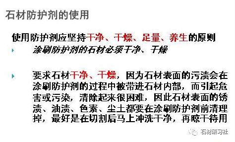 從上面這張PPT可以看到,在進(jìn)行石材防護劑的選擇時(shí),主要考慮四個(gè)方面的問(wèn)題,防護什么石材;具體的防護部位和施工方法;石材的鋪裝施工方法;要防止的污染源。這四個(gè)方面還要綜合去考慮,才能使石材的防護達到理想的效果,下面就來(lái)看看四個(gè)方面如何具體進(jìn)行實(shí)施。