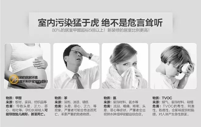 事實(shí)上,裝修除了會(huì )產(chǎn)生甲醛這個(gè)大魔頭之外,還會(huì )產(chǎn)生苯、氨、TVOC等這些小妖怪。它們群魔亂舞,肆意攻擊人的身體,輕則讓人惡心、頭痛、呼吸不暢,重則會(huì )導致人的身體出現癌變。