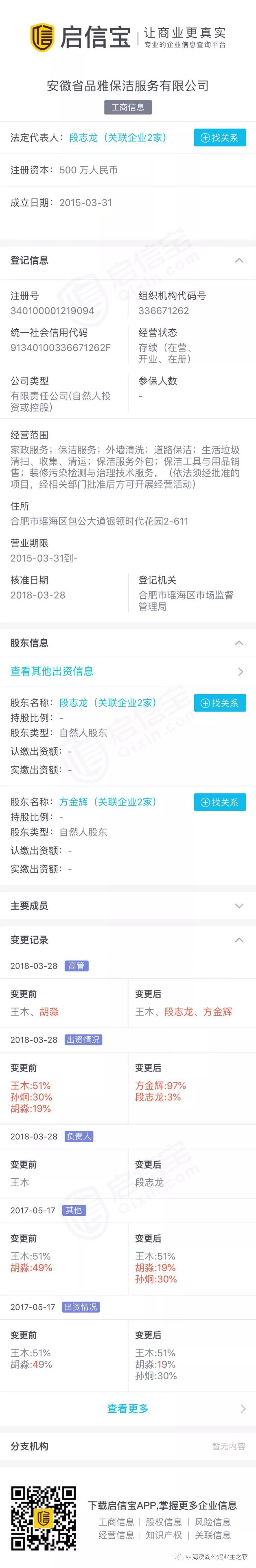 然后,小編通過(guò)啟信寶扒了扒,這個(gè)叫做“安徽省品雅保潔服務(wù)服務(wù)有限公司”的工商信息,如下所示:
