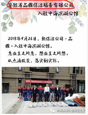 2018年9月26日,中海濱湖公館的宏洋物業(yè)各大管家在朋友圈發(fā)布“安徽省品雅保潔服務(wù)有限公司”入駐中海濱湖公館,小編還是非常的興奮。前期志愿者多次與物業(yè)溝通,原來(lái)的保潔公司存在諸多的問(wèn)題,比如長(cháng)期不打掃衛生、年齡偏大、人員配置不足甲級標準的一半人數,代打卡等,都希望能夠更換保潔公司,如今真的做到了。如下圖: