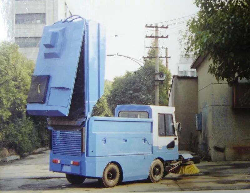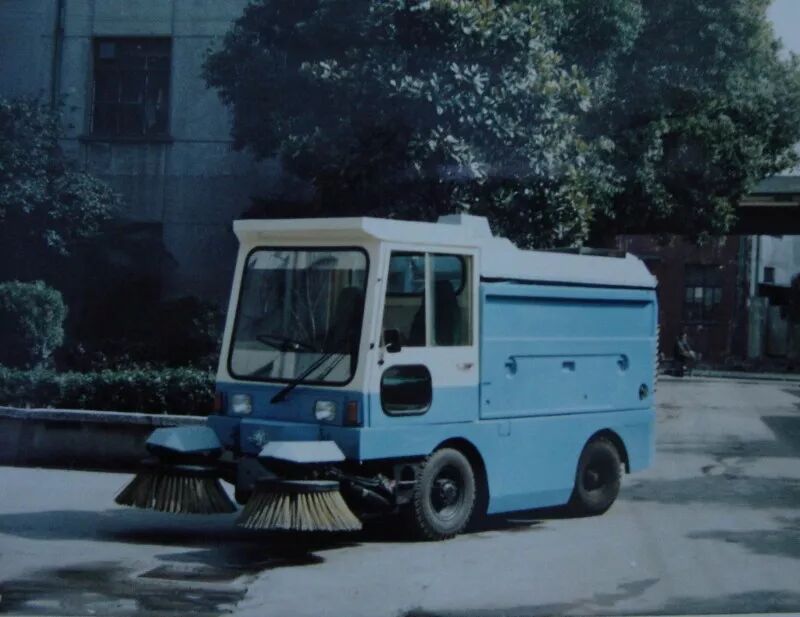 70年代中期以后,保潔車(chē)開(kāi)始逐漸取代人力,專(zhuān)門(mén)進(jìn)行道路沖洗。到了1985年,上海有大約26輛2噸的沖洗車(chē)。當時(shí)的沖洗車(chē)前右側有一只龍頭,發(fā)水時(shí)只需開(kāi)啟龍頭,水柱就向溝底射出,后右側有一把圓形尼龍絲掃帚,轉動(dòng)時(shí)將灰沙和積垢一起掃清。