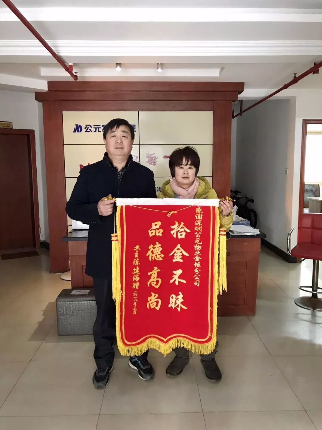 為表達感激之情,陳先生特意定做了一面繡有“品德高尚 拾金不昧”字樣的錦旗送到物業(yè)管理處,肯定了保潔員萬(wàn)志英拾金不昧的可貴品質(zhì)。