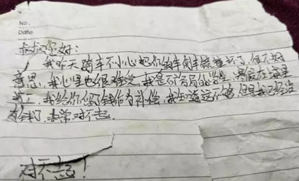 一位學(xué)生騎電動(dòng)不慎撞上了停在路邊的寶馬車(chē),車(chē)主不在現場(chǎng),他本可以不管不顧立刻離開(kāi),但他選擇為自己的錯誤負責:寫(xiě)了一封道歉信,并用信封包著(zhù)寒假打工掙來(lái)的300多元現金,黏在車(chē)把手內。