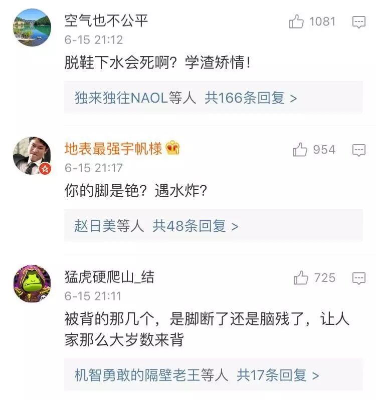 6月15日,一段話(huà)題為“保潔阿姨背大學(xué)生過(guò)河”的視頻在網(wǎng)絡(luò )上瘋傳。視頻中,幾名中年女保潔員背著(zhù)大學(xué)生來(lái)回蹚過(guò)積水的舉動(dòng)引發(fā)網(wǎng)友們的熱議,紛紛表示「現在的大學(xué)生太嬌氣了」。爭議視頻如下:
