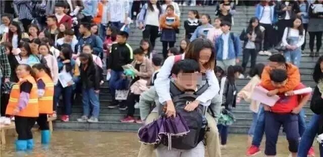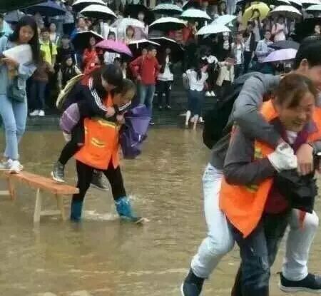 事情發(fā)生在貴州省六盤(pán)水市六盤(pán)水師范學(xué)院,一場(chǎng)大雨過(guò)后,因地勢低洼,學(xué)校內大面積積水。學(xué)校于15日上午安排保潔阿姨用長(cháng)凳搭起“橋梁”,并且在水中扶著(zhù)學(xué)生們過(guò)“河”,這其中就有很多學(xué)生被保潔阿姨背著(zhù)“過(guò)河”。