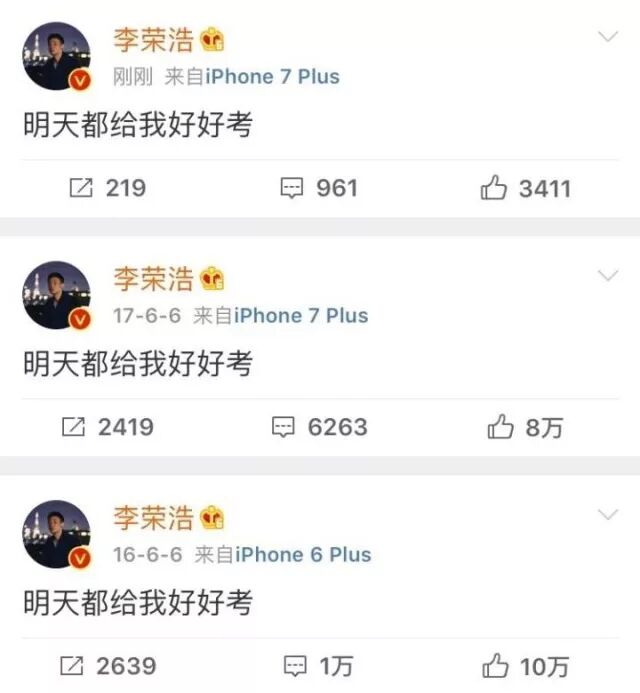 在微博上,有很多人為易烊千璽和考生加油。李榮浩就在微博上發(fā)了這么一句話(huà):“明天都給我好好考?!?/span>