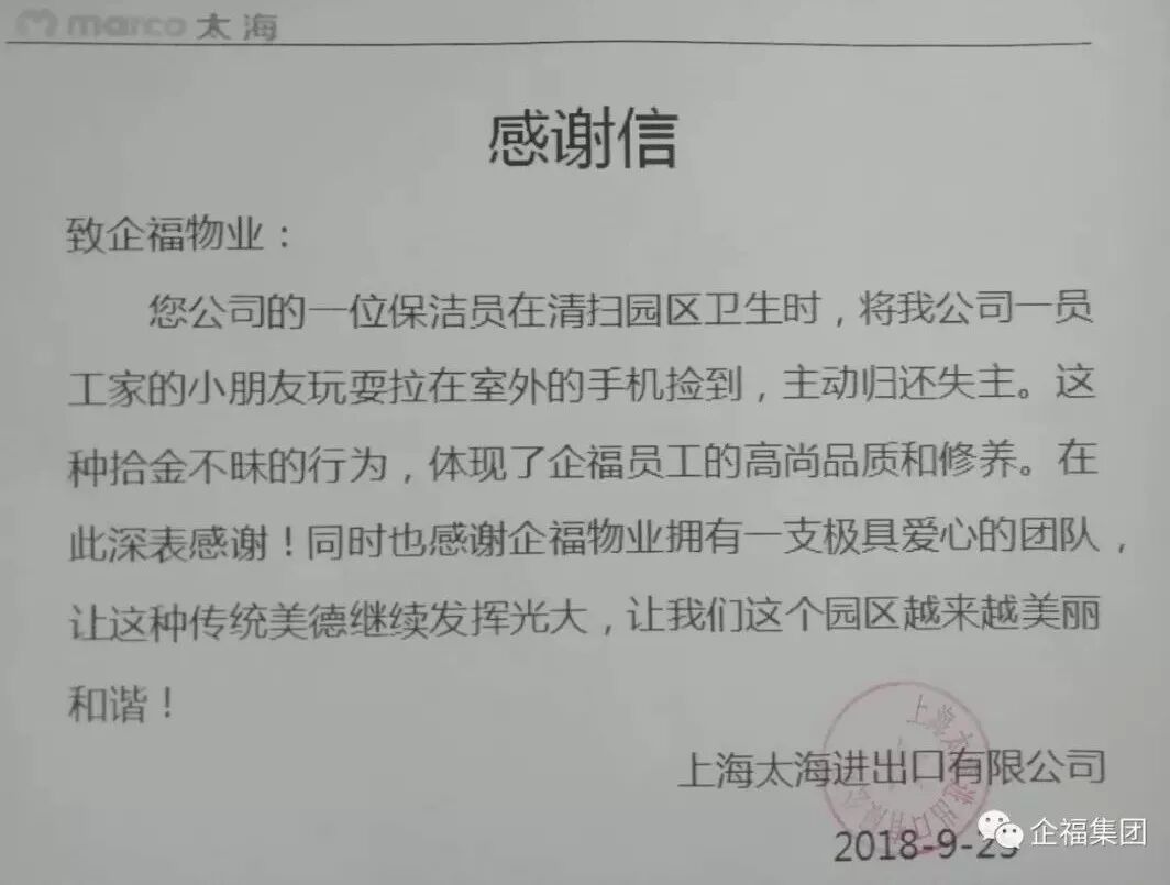 9月25日,一封感謝信發(fā)在企福智能科技園企業(yè)交流微信群內,引得大家紛紛點(diǎn)贊。原來(lái)是園區入駐企業(yè)上海太海公司感謝企福物業(yè)保潔員朱永仁拾到該企業(yè)員工一部手機及時(shí)歸還,稱(chēng)贊他拾金不昧品德高尚,稱(chēng)贊企福物業(yè)有一支具有愛(ài)心的團隊。