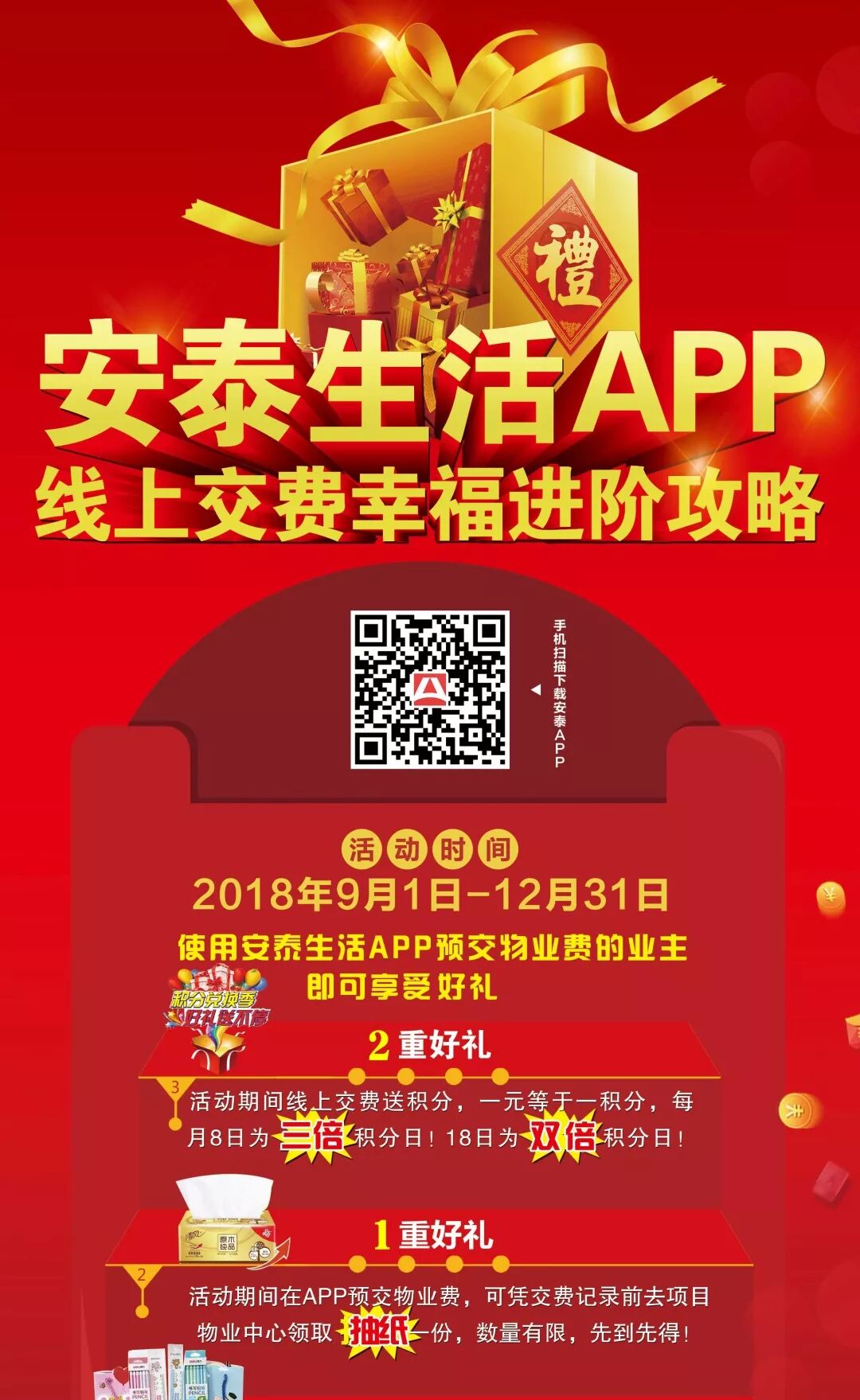 4. 【線(xiàn)上預交物業(yè)費,雙倍積分等你來(lái)】業(yè)主繳納物業(yè)費,即可享受1元等于1積分。9月1日至12月31日每月8日,積分三倍!每月18日,積分雙倍!積分換禮,為品質(zhì)生活錦上添花!