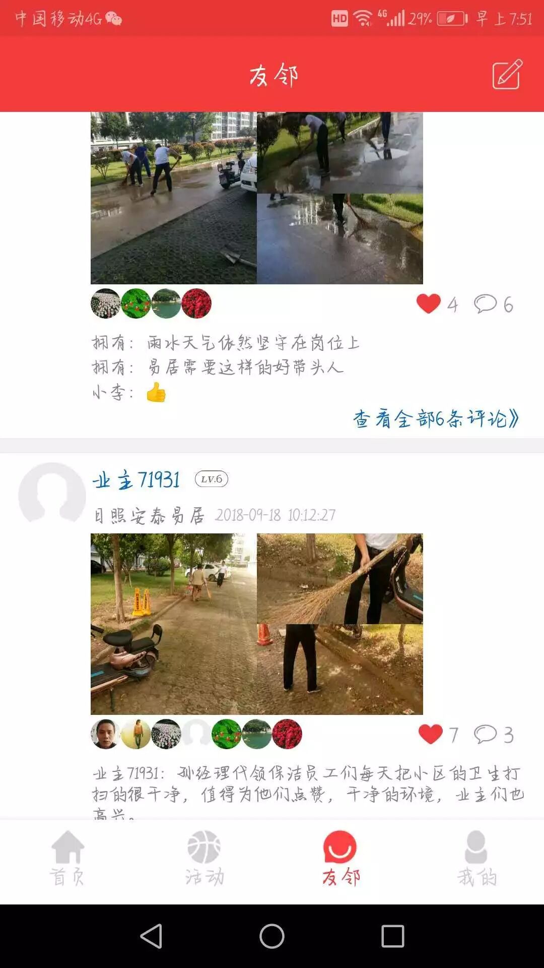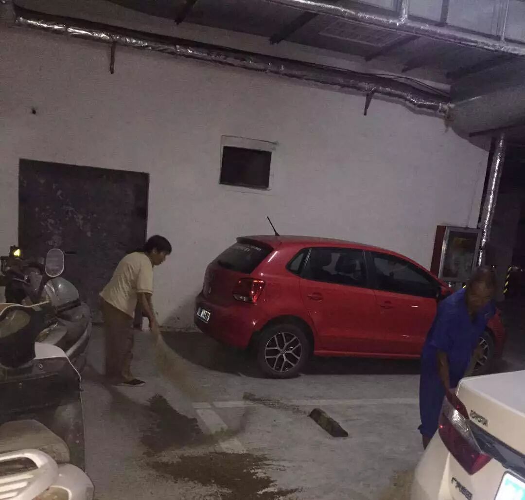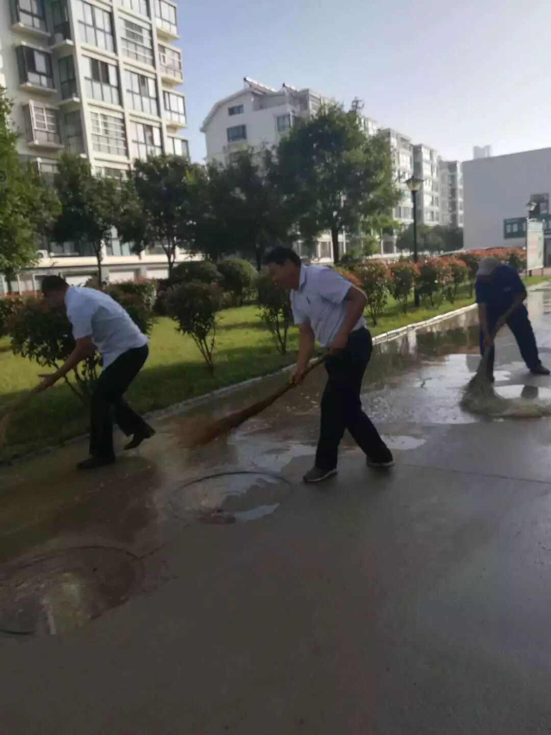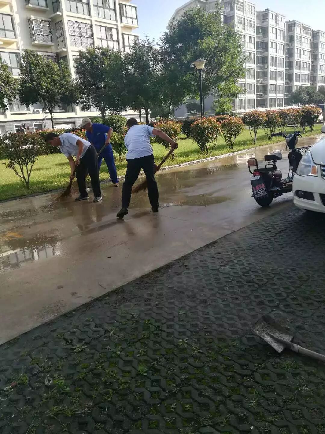 5、連日的下雨天,小區內的道路出現積水和泥濘路段,為排除業(yè)主的出行困難,各小區工作人員齊上陣及時(shí)處理道路積水和泥濘路。