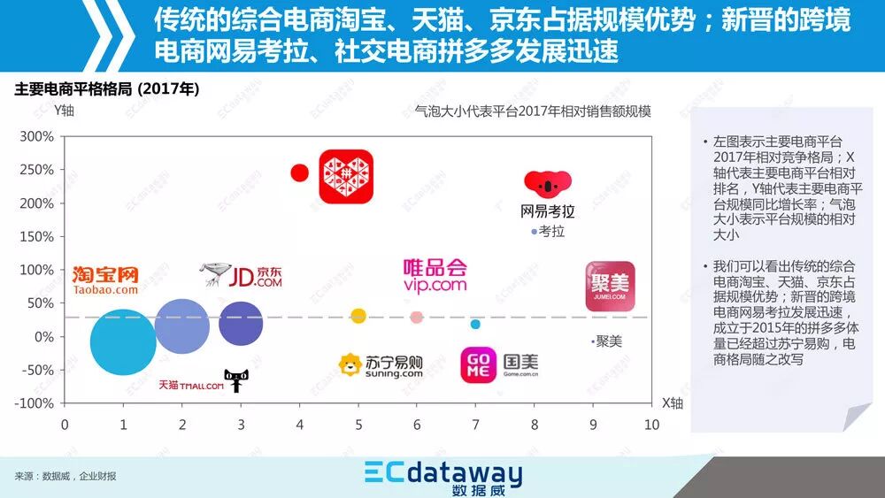 上圖中橫坐標是各電商平臺名次排名,縱坐標是增長(cháng)率,圓圈大小代表銷(xiāo)售規模,可以看出,相對交易額最大的電商平臺仍舊是淘寶、天貓、京東,這3個(gè)平臺有著(zhù)規模優(yōu)勢,可謂對整個(gè)電商平臺占據著(zhù)幾乎壟斷的地位,但是2017年有一個(gè)主打社會(huì )化營(yíng)銷(xiāo)的平臺進(jìn)入大家的視線(xiàn),拼多多, 相對銷(xiāo)售規模在所有平臺里排名第四,同比增長(cháng)率卻達到第一,還有就是新晉的跨境電商平臺網(wǎng)易考拉也表現出眾,雖然平臺規模目前比較小,但是增長(cháng)率也遠遠高于傳統電商平臺。