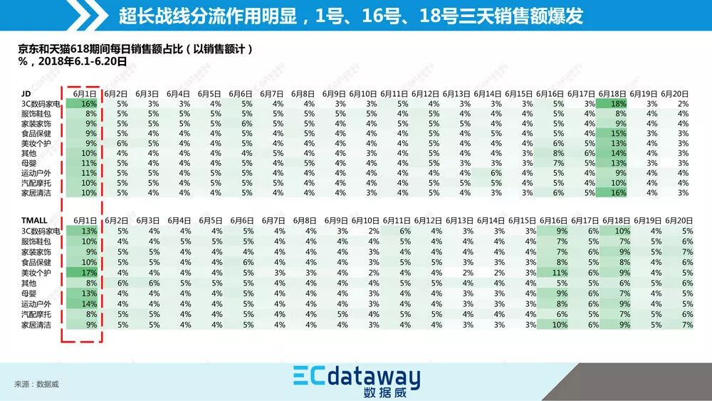 天貓6月1日、16日、17日、18日為爆發(fā)期,京東6月1日、6月18日為爆發(fā)期,雖然銷(xiāo)售時(shí)間拉長(cháng)了,但是爆發(fā)期相對比較集中。