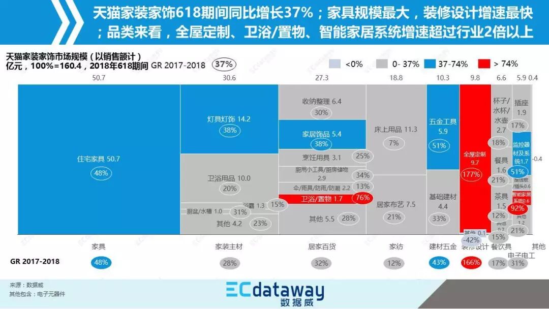 以天貓家裝家飾行業(yè)整體37%增速作為倍數基數,細分品類(lèi)是整體增速2倍以上的用紅色顯示(即74%以上),1~2倍之間的用藍色表示(即37~74%之間),從上圖中可以看出,住宅家具、燈具燈飾、家居飾品等子類(lèi)目同比增長(cháng)大于家裝家飾行業(yè)37%的同比增長(cháng)幅度一倍以上,而衛浴/置物、智能家居系統、全屋定制這3個(gè)子類(lèi)目超過(guò)行業(yè)同比增長(cháng)2倍以上,其中全屋定制類(lèi)目尤為突出,同比增長(cháng)高達177%,遠超行業(yè)整體增速。