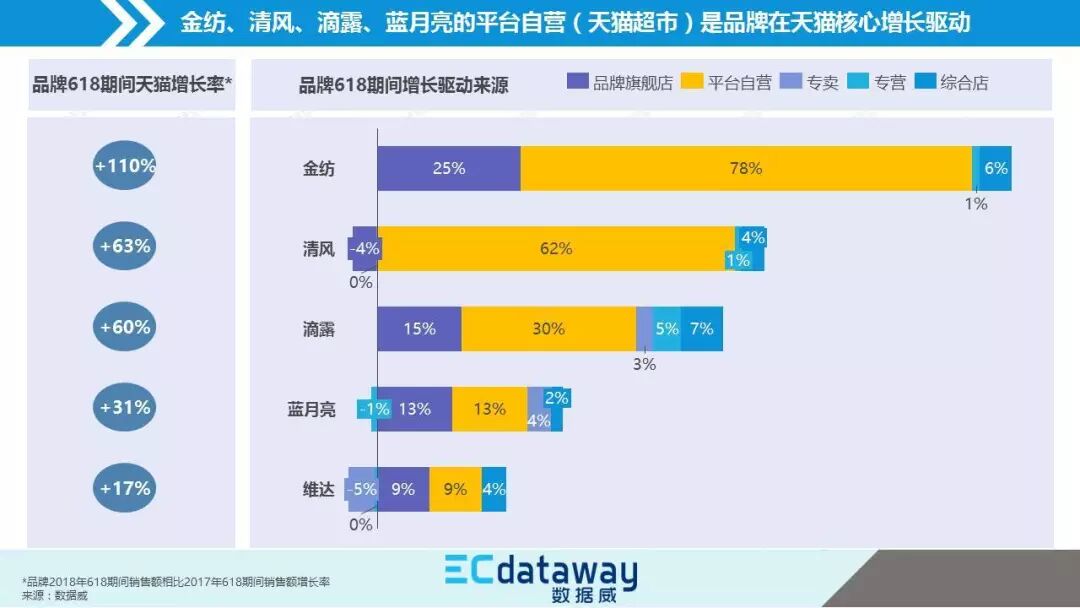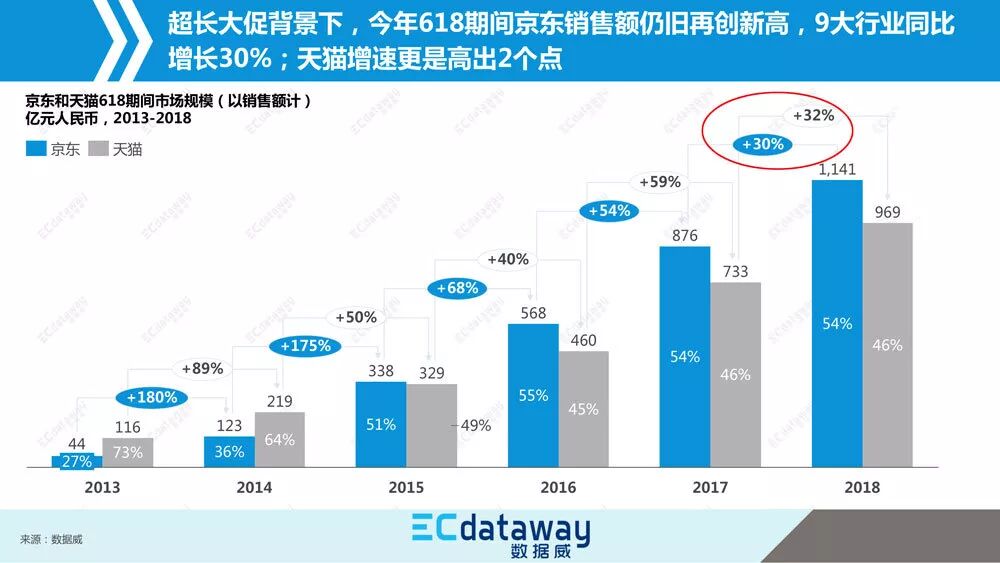 再看上圖,對比每年618京東和天貓平臺的銷(xiāo)售額,以及增長(cháng)率,雖然大促時(shí)間變長(cháng)稀釋了6月18日當天的集中爆發(fā)力,但是對整個(gè)618周期內的銷(xiāo)售還是有幫助的,2018年的618天貓銷(xiāo)售額增長(cháng)比例達32%,超過(guò)京東2個(gè)點(diǎn)。
