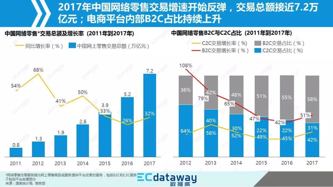 從2014年到2016年中國網(wǎng)絡(luò )零售交易總額不斷上升,隨交易額基數增長(cháng),同比增長(cháng)率卻一直持續下降趨勢,而2017年網(wǎng)絡(luò )零售交易增速又一次實(shí)現反彈,而作為電商起點(diǎn)的C2C交易額占有率卻持續下滑,B2C連年上漲的趨勢也預示著(zhù)品牌方對電商渠道的重視與日俱增。