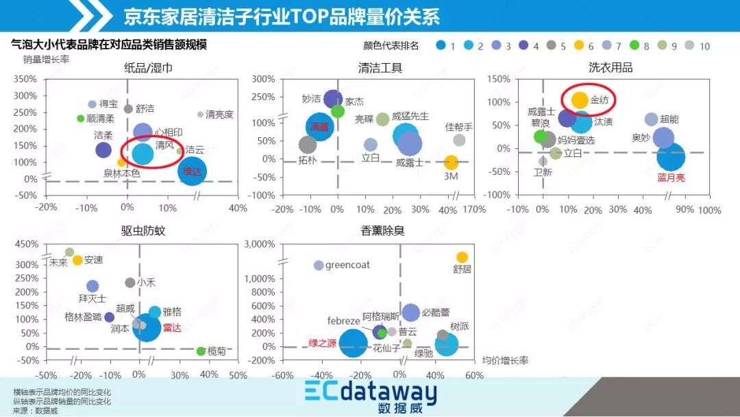 從上圖(京東平臺家居清潔行業(yè))我們可以看出,紙巾/濕巾子行業(yè)內清風(fēng)品牌,均價(jià)略微提高5%左右的情況下,銷(xiāo)售額增長(cháng)約100%左右,洗衣用品子行業(yè)的金紡品牌表現搶眼,均價(jià)增長(cháng)約15%左右,銷(xiāo)售額依然獲得100%左右的增長(cháng)。