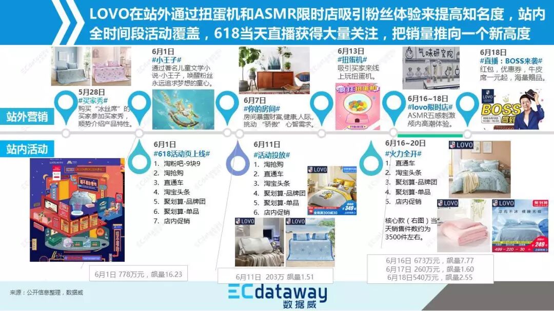 LOVO在5月28日的官方渠道重點(diǎn)推送了夏天主打款”冰絲席“并配合預售,在6月1日當天又搶占了幾乎所有的平臺核心活動(dòng)流量渠道,如聚劃算、淘搶購等,輔以站外“小王子”的解讀喚醒粉絲夢(mèng)想等活動(dòng),在6月1日迎來(lái)第一波爆發(fā),銷(xiāo)售總額超過(guò)700萬(wàn)元,6月7日通過(guò)裝飾你的房間,切中追求“精致”生活的買(mǎi)家心智需求, 6月11日再次銷(xiāo)售額爆發(fā)超過(guò)200萬(wàn)元,6月13日LOVO線(xiàn)上游戲“扭蛋機”,16日線(xiàn)下開(kāi)放了當下熱門(mén)概念-顱內高潮AMSR體驗店,18日視頻直播-“BOSS來(lái)襲”,送優(yōu)惠券、紅包,一元搶等活動(dòng),徹底點(diǎn)燃了買(mǎi)家的購物熱情,最終迎來(lái)了第三個(gè)爆發(fā)節點(diǎn),6月16~18日,單是天貓平臺銷(xiāo)售總額已超1400萬(wàn)元,整個(gè)品牌在618期間運營(yíng)與推廣流程一氣呵成,站內站外相互呼應。