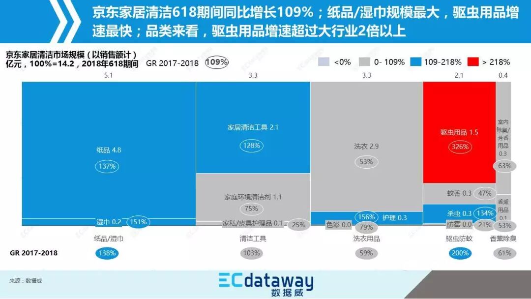 以京東平臺家居清潔行業(yè)整體109%增速作為倍數基數,細分品類(lèi)是整體增速2倍以上的用紅色顯示(即218%以上),1~2倍之間的用藍色表示(即109~218%之間),紙品,濕巾等子類(lèi)目同比增長(cháng)大于家居清潔行業(yè)109%的同比增長(cháng)幅度一倍以上,而驅蟲(chóng)用品子類(lèi)目超過(guò)行業(yè)同比增長(cháng)2倍以上,高達326%,約為整個(gè)行業(yè)增速比例的3倍之多。