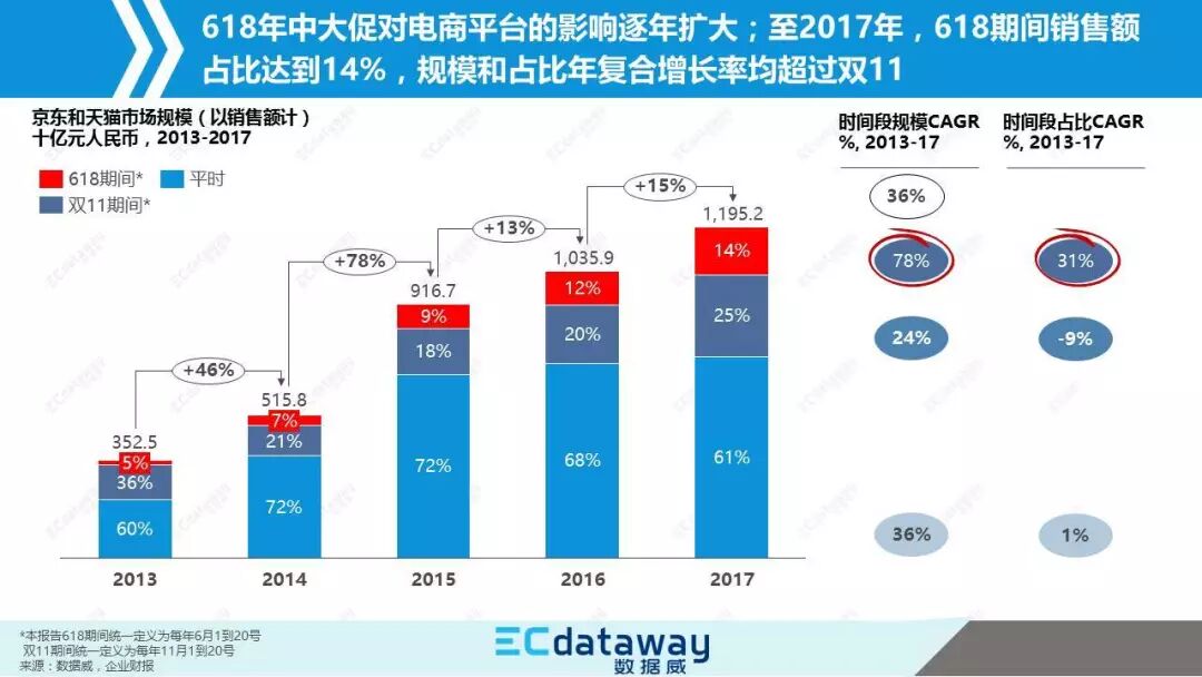 618年終大促從2013年的全年銷(xiāo)售占比5%一直到2017年的全年銷(xiāo)售占比14%,連續5年的連年增長(cháng),讓618變得越來(lái)越重要,甚至2017年618期間銷(xiāo)售額無(wú)論規模還是占比年復合增長(cháng)率均超過(guò)當年雙11。