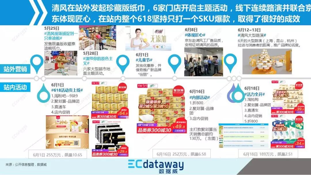 5月25日清風(fēng)牽手“泰迪熊”發(fā)售限量泰迪熊款限量紙巾,成功圈粉一波“泰迪”迷,5月28日在大型超市開(kāi)啟“原色主義”主題活動(dòng),6月1日在618活動(dòng)開(kāi)啟當天線(xiàn)上就通過(guò)搶占主要流量渠道,配合站外比如淘粉吧等活動(dòng)全面開(kāi)啟銷(xiāo)售高潮,將第一波銷(xiāo)售爆發(fā)定格在6月1日,銷(xiāo)售總額超過(guò)200萬(wàn)元,6月8日京東人員遠赴清風(fēng)工廠(chǎng),變相為清風(fēng)的“匠心”當了一次“公證人”,“清風(fēng)品質(zhì)”的可信度變得更高了,6月12日開(kāi)始的上海、昆山、杭州的大型路演,再次拉近了買(mǎi)家與品牌的距離,提高了品牌的知名度,站內站外電商渠道推廣也隨著(zhù)站外地面活動(dòng)連軸轉,聚劃算、淘搶購,折800等核心活動(dòng)“輪番轟炸”著(zhù)“剁手黨”們的購物神經(jīng),終于迎來(lái)了6月16~18日的銷(xiāo)售高潮,3天總銷(xiāo)額超500萬(wàn)。