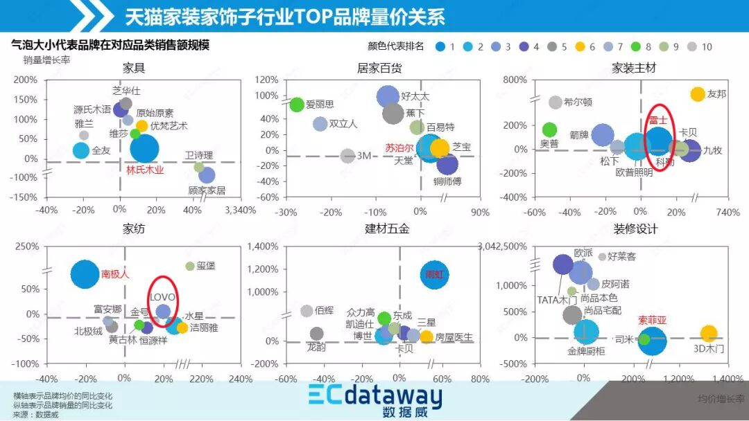 橫坐標代表均價(jià)增長(cháng)率,縱坐標代表銷(xiāo)量增長(cháng)率,從上圖(天貓平臺家裝家飾行業(yè))我們可以看出,家紡子行業(yè)內的LOVO品牌,均價(jià)提高20%左右的情況下,銷(xiāo)售額增長(cháng)約15%左右,家裝主材子類(lèi)目的雷士品牌,均價(jià)增長(cháng)約10%左右,銷(xiāo)售額依然有50%左右的增長(cháng),獲得不俗戰績(jì)。