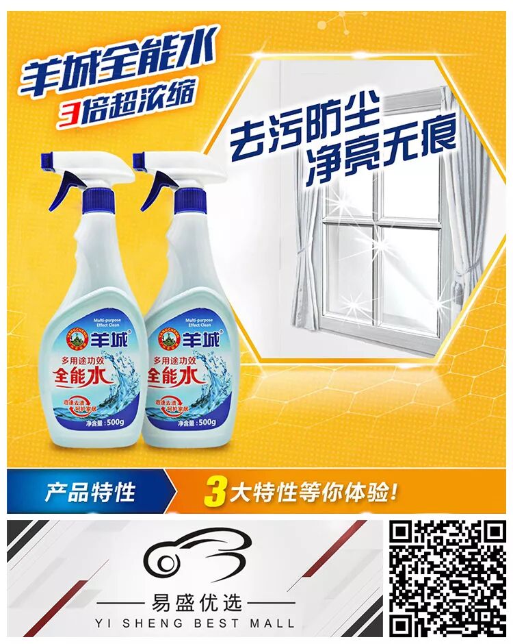 羊城多用途全能水,以其豐富用途(針對日常家居清潔,還適用于亞克力、汽車(chē)儀表盤(pán)、塑料凳表面和貼面家具)、用量少、無(wú)傷害的強勁手段,展示出其“三大特性”:迅速瓦解污垢、閃亮無(wú)水痕、防塵持久。讓你清潔中輕松應付自如。