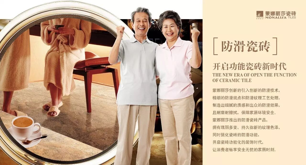 早在2013年,蒙娜麗莎就針對老齡化人群的特殊需求進(jìn)行開(kāi)發(fā),推出了摩擦系數高于0.6以上的功能性防滑瓷磚——拉菲經(jīng)典系列防滑仿古磚。
