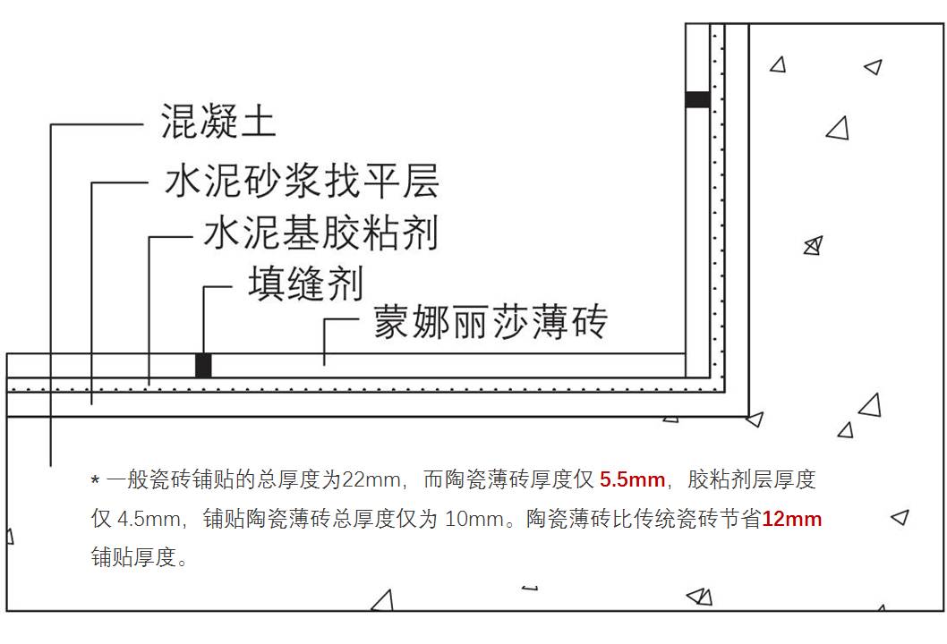 在家居裝修中,鋪貼墻磚能有效避免墻面滲水和開(kāi)裂問(wèn)題,MONALISA 陶瓷薄磚系列厚度僅 5.5mm,能為空間擴容達10%,是二次裝修的理想選擇。