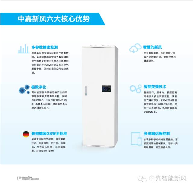 功能方面看看凈化率、殺菌、輸氧、無(wú)噪音、省能耗這幾點(diǎn)。中嘉新風(fēng)99.9%過(guò)濾PM2.5,確?!笆覂缺仁彝鉂崈?00倍”。中嘉新風(fēng)利用微正壓原理將室內臟空氣100% 排出,源源不絕地引入新鮮空氣。中嘉新風(fēng)通過(guò)紫外線(xiàn)殺菌消毒,杜絕空氣傳播的疾病。中嘉新風(fēng)系統低噪靜音,不影響生活質(zhì)量。省費用——新風(fēng)熱回收。在空調使用季節,開(kāi)窗通風(fēng)或風(fēng)機通風(fēng),會(huì )加大空調能耗。中嘉新風(fēng)機具備熱回收功能,最高能回收排風(fēng)中80% 的熱能。