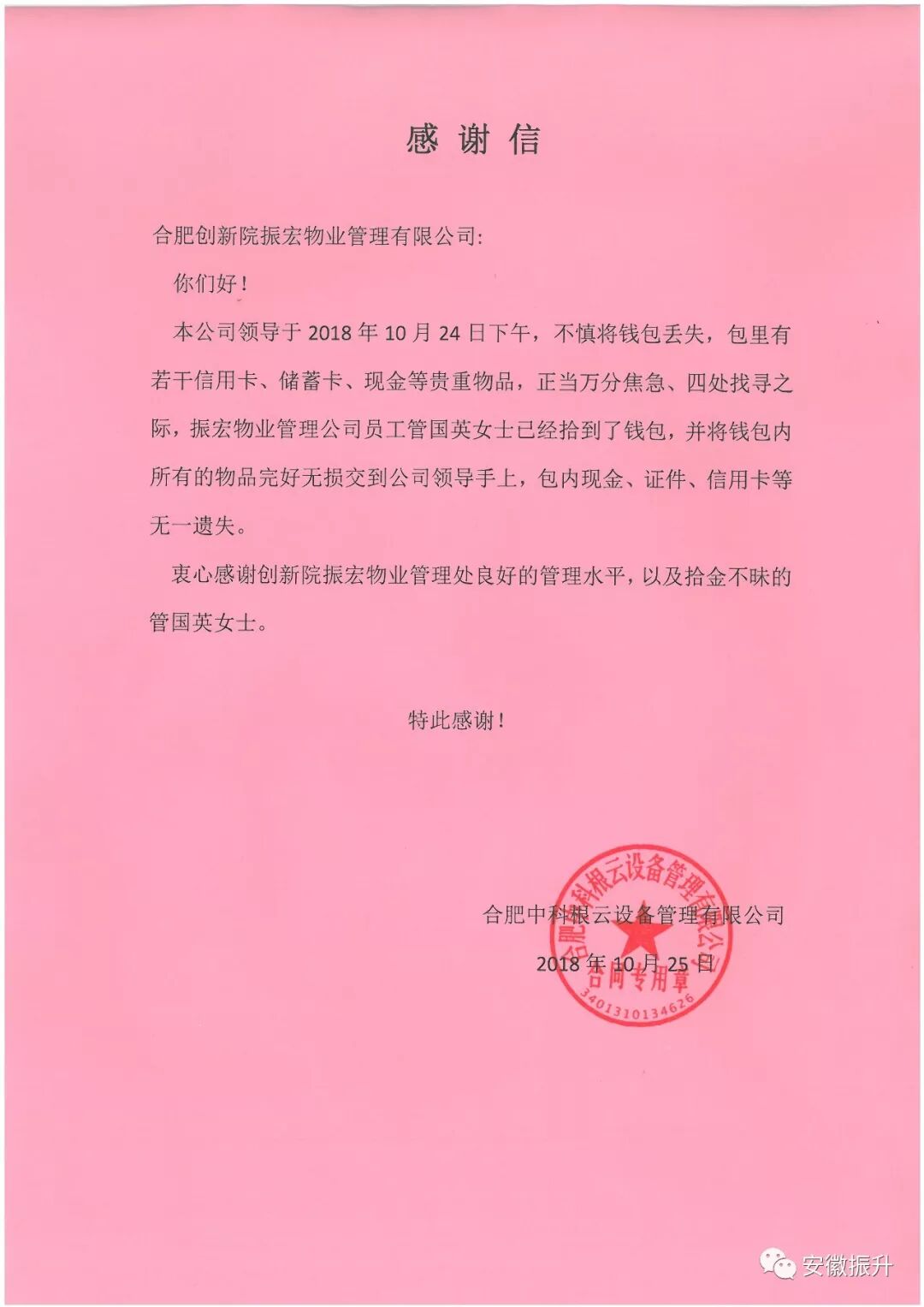 本網(wǎng)訊(張彬 躬耕)“你們不僅扮靚了創(chuàng )新院的環(huán)境,更以拾金不昧的高尚品德擦亮了振升保安集團振宏物業(yè)保潔員的服務(wù)品牌?!?0月25日,合肥中科根云董事長(cháng)何玉杰為我集團振宏物業(yè)送來(lái)感謝信,贊揚振宏物業(yè)公司保潔員管?chē)⑹暗狡溴X(qián)包后迅速奉還的事跡。