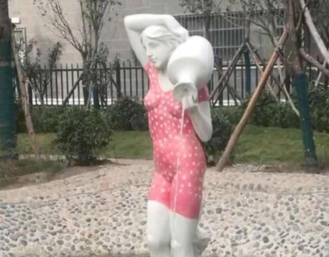 10月20日,河南平頂山一小區歐式裸女洗浴雕塑被刷上紅色泳衣,經(jīng)媒體報道后雕塑被刷成全白色,恢復“全裸”狀態(tài)。小區內大爺大媽說(shuō)沒(méi)穿衣服不文明,還是穿上好看。