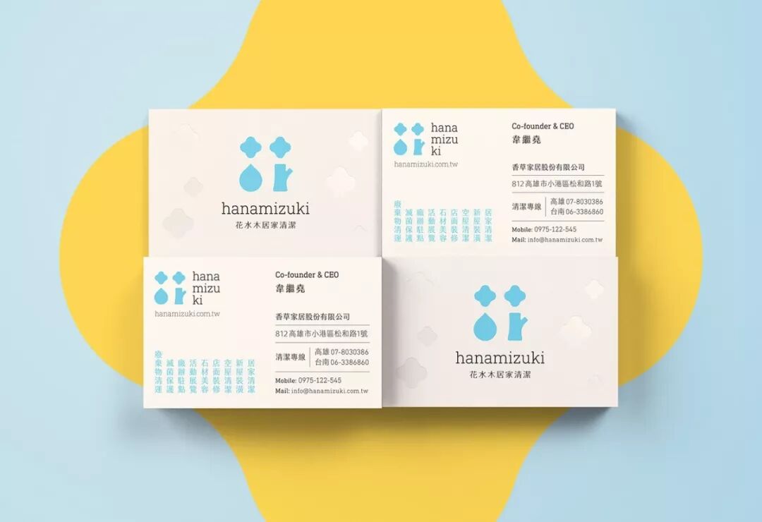 Hanamizuki是一家新興的公司,專(zhuān)門(mén)從事室內和辦公室清潔,使用環(huán)保清潔劑。除了清潔服務(wù),他們還制造和銷(xiāo)售自己的品牌洗滌劑。自然清潔的核心價(jià)值是通過(guò)它的名字來(lái)揭示:Haa=花,MiZu=水,Ki=木。所有的洗滌劑都是從花木中提取的水和油制成的。三個(gè)簡(jiǎn)單的形狀被用來(lái)顯示三個(gè)單獨的元素。整個(gè)要素結合在一起,形成一個(gè)漢字“花”,這是巧妙地響應的第一個(gè)字“HANA”。這些形狀被重新排列,創(chuàng )造出生動(dòng)的視覺(jué)語(yǔ)言,展現了Hanamizuki的幽默感。
