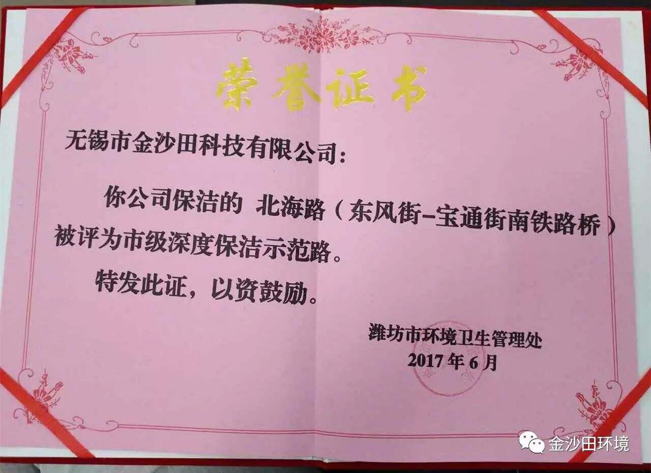 為持續推進(jìn)深度保潔工作的開(kāi)展,濰坊市環(huán)衛處從城區各環(huán)衛相關(guān)部門(mén)抽調一名工作人員組成市級深度保潔示范路考核組,按照省級示范路考核標準制定了深度保潔示范路創(chuàng )建實(shí)施辦法和考核標準,對各區上報的深度保潔道路進(jìn)行綜合考核,金沙田濰坊項目部所負責的北海路(東風(fēng)街-寶通街南鐵路橋)路段達到深度保潔“以克論凈”的嚴格標準要求,被濰坊市環(huán)境衛生管理處評為市級深度保潔示范路。