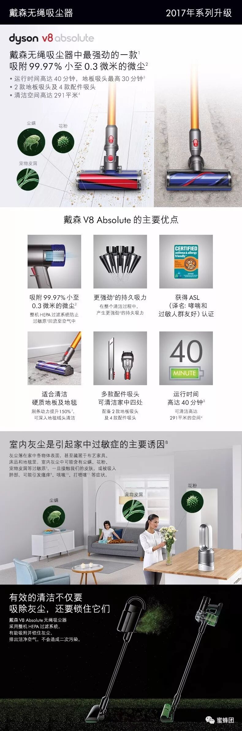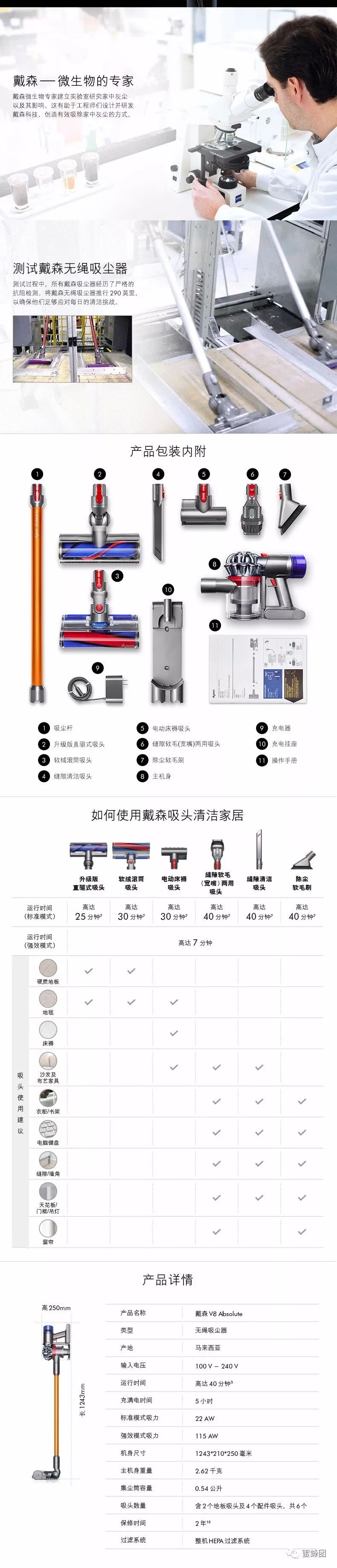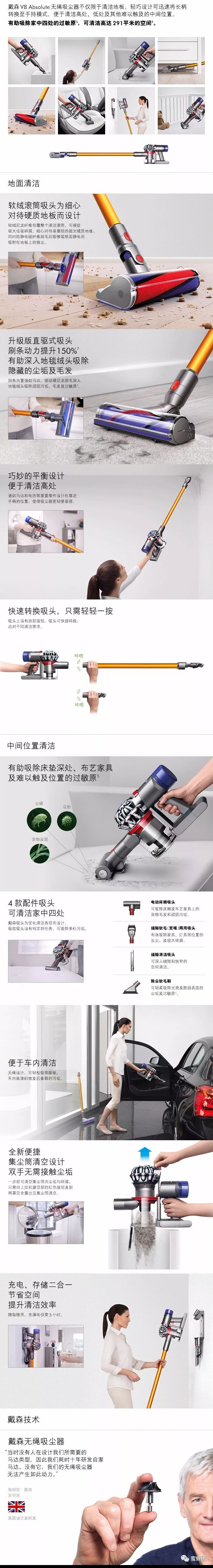 戴森吸塵器用過(guò)的都說(shuō)好,V8 Absolute無(wú)線(xiàn)吸塵器是戴森系列吸塵器中的全明星產(chǎn)品,它的運行時(shí)間高達40分鐘!清潔孔家可以達到291平米。