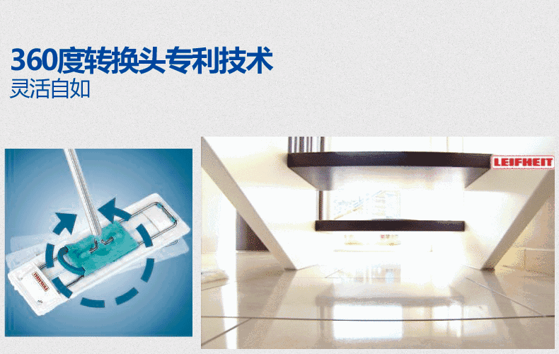 有圖有真相:萬(wàn)象轉接頭可360度旋轉,邊邊角角都能緊密貼合,平面、立面無(wú)縫切換,清潔不留死角,連犄角旮旯里的灰塵都無(wú)處藏身。最最關(guān)鍵的是:極其省力,不用彎腰~(自行腦補彎腰拖地100平米+的畫(huà)面,那是可怕之極)