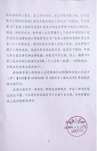 最終,深圳市人民政府于2018年4月25日作出行政復議決定,維持深圳市人社局作出的工傷認定。