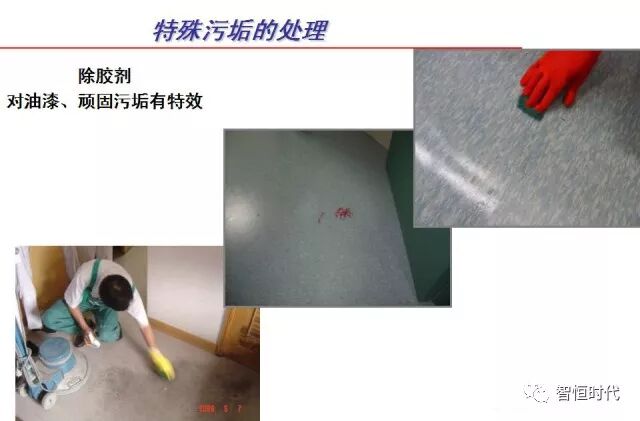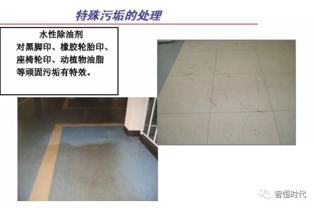 其中楊老師講解的科學(xué)復配清潔藥劑的方法以及列舉的幾項清潔難題案例讓人印象非常深刻,例如去除滴在彈性地面上的膠水、地下停車(chē)場(chǎng)的黑色輪胎印、油漆污塊等。只要使用科學(xué)配比的專(zhuān)業(yè)清潔藥劑,就可以輕松瓦解這些頑固污漬:
