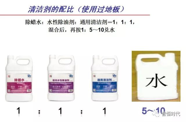 彈性地面的清洗,使用最有效、科學(xué)的復配方法:除蠟水:水性除油劑:通用清潔劑=1:1 : 1,混合后,按1 : 5~10兌水,可以輕松去除長(cháng)久積累的和各種難處理的污漬。