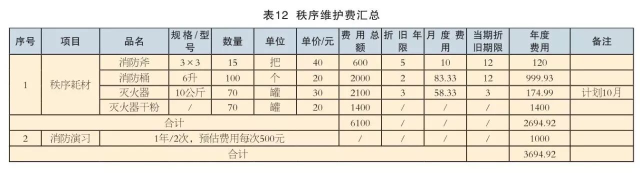項目進(jìn)行消防管理的全部費用,根據《秩序維護采購計劃》進(jìn)行編制,如含消防斧、消防桶、防毒面具、消防扳手、滅火器等物資以及消防演練發(fā)生的費用,未超一年的,不計算折舊費。