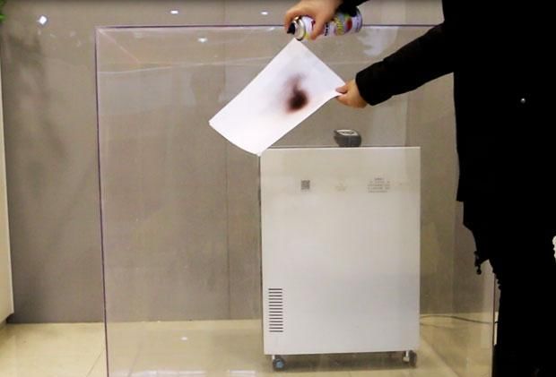 在一個(gè)1立方米的亞克力四方形罩子內,擱置噴有油漆的紙張,模擬甲醛高濃度環(huán)境。測得亞克力四方罩子甲醛原始值為0.02mg/m3,將噴有油漆的紙張放入罩子里,不久罩子內的甲醛濃度升至0.4mg/m3;開(kāi)啟帶有除甲醛功能的空氣凈化器,將排風(fēng)量開(kāi)到最大檔,每30秒觀(guān)察甲醛濃度數值變化情況。