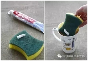 酒店面盆邊上的積垢,可用一小撮亂頭發(fā)蘸點(diǎn)牙膏擦試,可很快除去積垢。