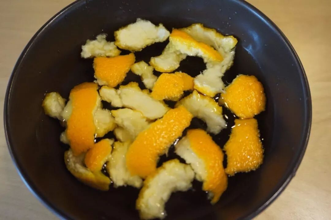 步驟二:其余的橙皮切細,用作制作無(wú)添加清潔劑,加水滾熱半小時(shí)。