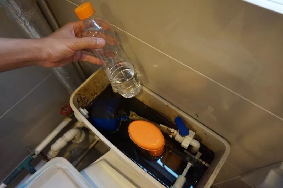步驟二:把保特瓶放于馬桶水箱內。每次沖水,醋便會(huì )順水流出。
