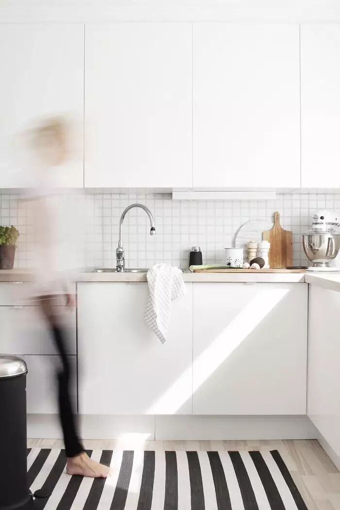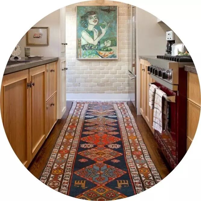 但實(shí)際上我想說(shuō),這也不過(guò)是托詞和老舊的思維。我在廚房里鋪了將近八年的毯子,當然不是羊毛地毯,而是碎布做的小塊毯子,在這期間,每天一樣做中餐,并不是問(wèn)題。廚房里鋪一些地毯的好處是視覺(jué)效果很好,越是一般人不習慣鋪地毯的地方,鋪上了,越顯得與眾不同。而且,它能讓廚房更溫暖,有潔凈感,和上一代傳統家庭廚房是重油之地的感覺(jué)完全不同。另外,鋪了毯子后,不自覺(jué)地就會(huì )減少油煙烹飪,更多使用烤箱和蒸煮,也更勤快地隨手打掃、擦拭,這難道不是更健康、更好的生活方式嗎?