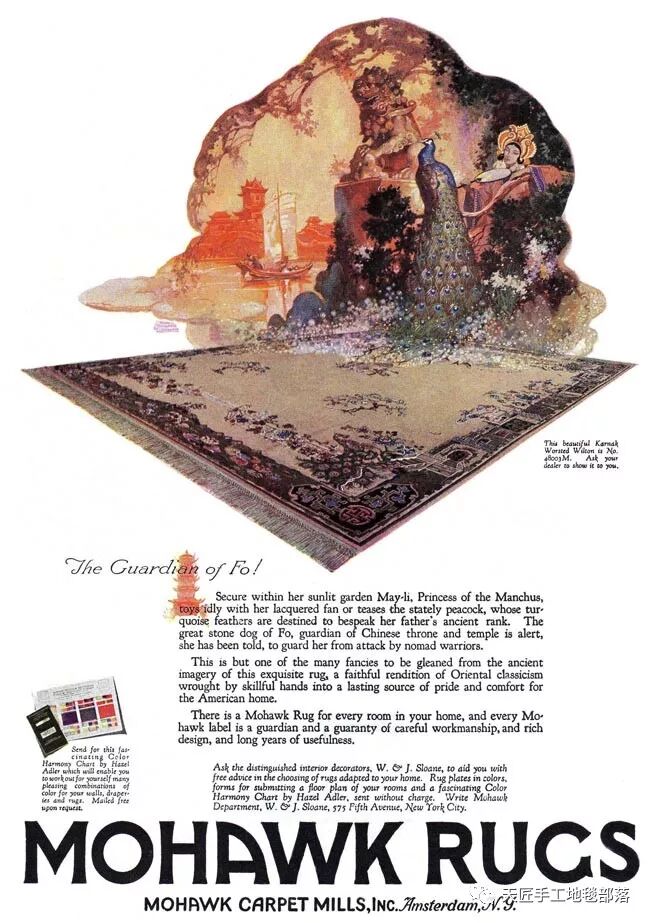 手工打結地毯歷史悠久,也被老外稱(chēng)之為“東方地毯”Oriental Rug, 因為這種地毯誕生于東方國家,包括伊朗、印度、中國等,而東方地毯近百年來(lái)都被老外追捧,比如在美國,上世紀20年代,就有一家公司,在雜志上瘋狂做廣告,推銷(xiāo)東方地毯,這家公司的名字以M開(kāi)頭,當然如今也依然在美國做著(zhù)地毯生意,但已經(jīng)轉向了機制地毯。但那些年曾經(jīng)做的手工地毯廣告,可謂腦洞清奇,給人留下了深刻的印象。下圖是他們其中一則廣告。